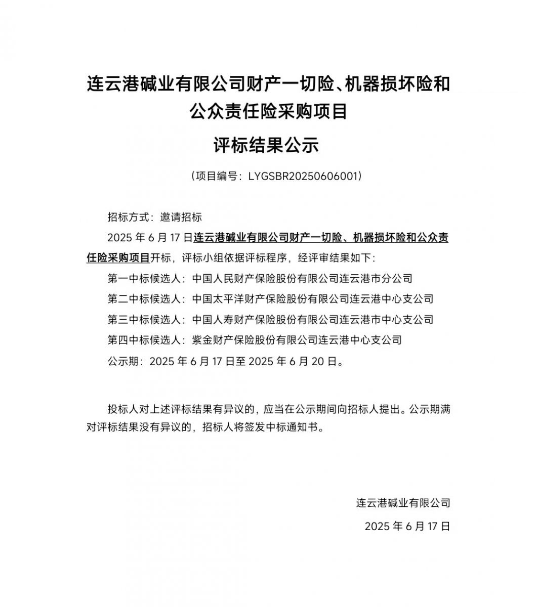 連云港堿業(yè)有限公司財(cái)產(chǎn)一切險(xiǎn)、機(jī)器損壞險(xiǎn)和公眾責(zé)任險(xiǎn)采購(gòu)項(xiàng)目評(píng)標(biāo)結(jié)果公示