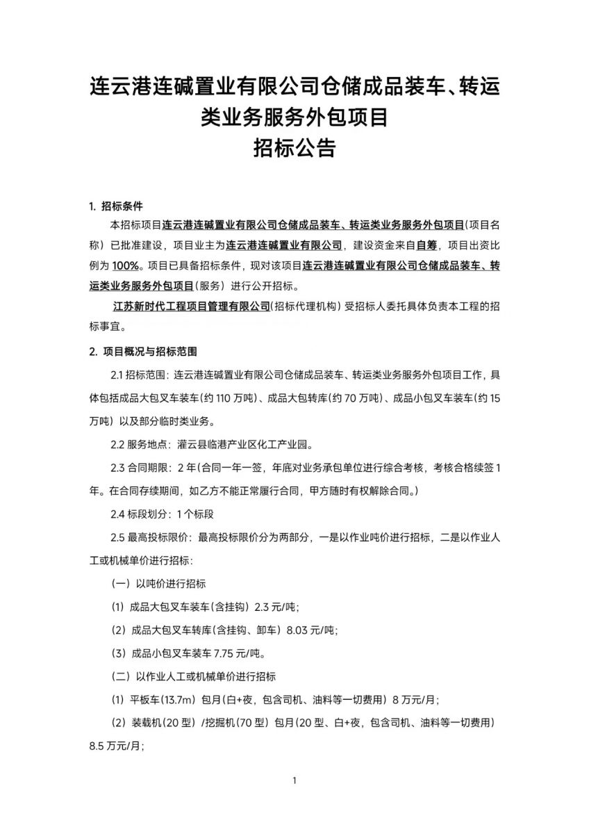 連云港連堿置業(yè)有限公司倉儲成品裝車、轉(zhuǎn)運(yùn)類業(yè)務(wù)服務(wù)外包項目招標(biāo)公告