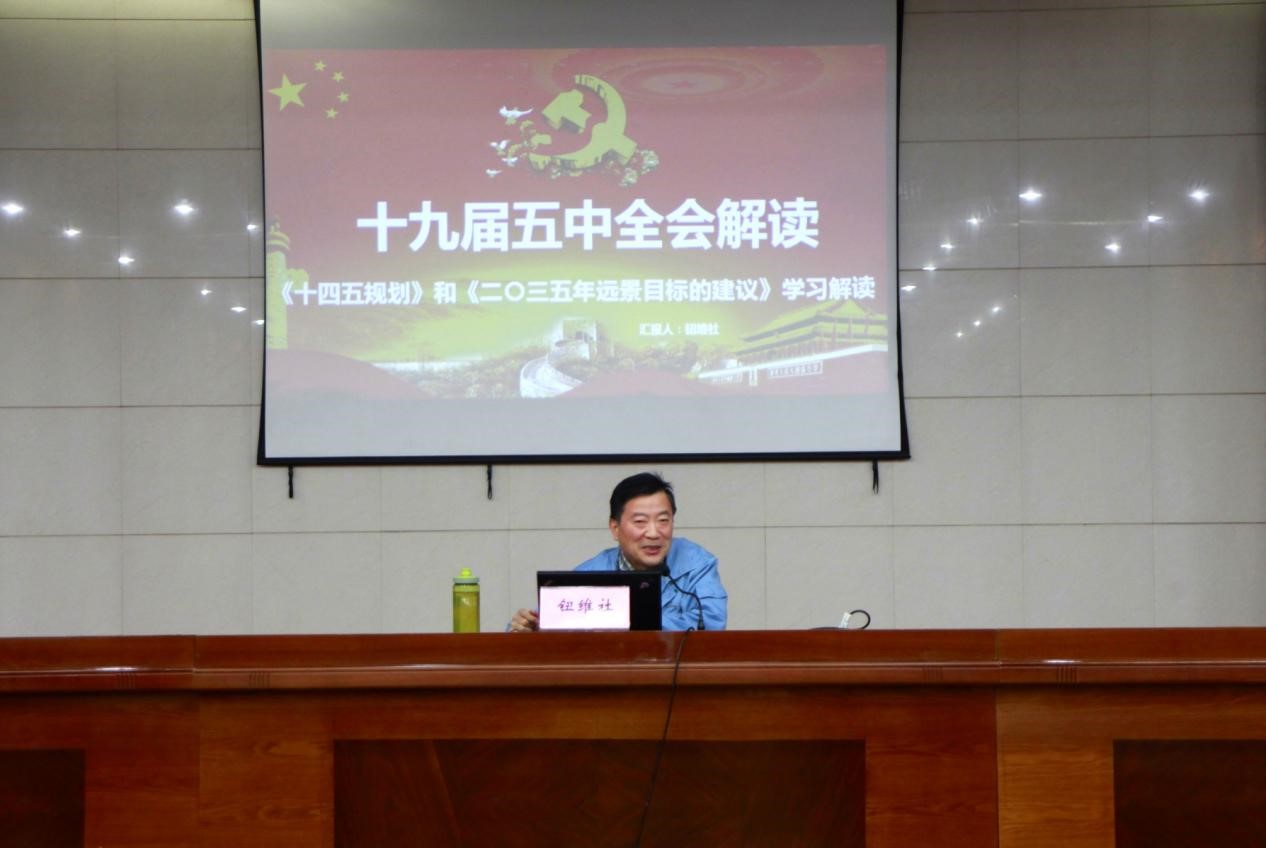 會(huì)上,鈕維社從“十九屆五中全會(huì)簡介”、“全會(huì)召開的背景和意義”、“回眸與展望”、“二0三五年遠(yuǎn)景目標(biāo)”、“十四五規(guī)劃”五個(gè)方面,結(jié)合具體事例,用通俗易懂的語言進(jìn)行了全面準(zhǔn)確的闡述,對我們認(rèn)真領(lǐng)會(huì)、準(zhǔn)確把握十九屆五中全會(huì)精神實(shí)質(zhì)具有十分重要的意義。