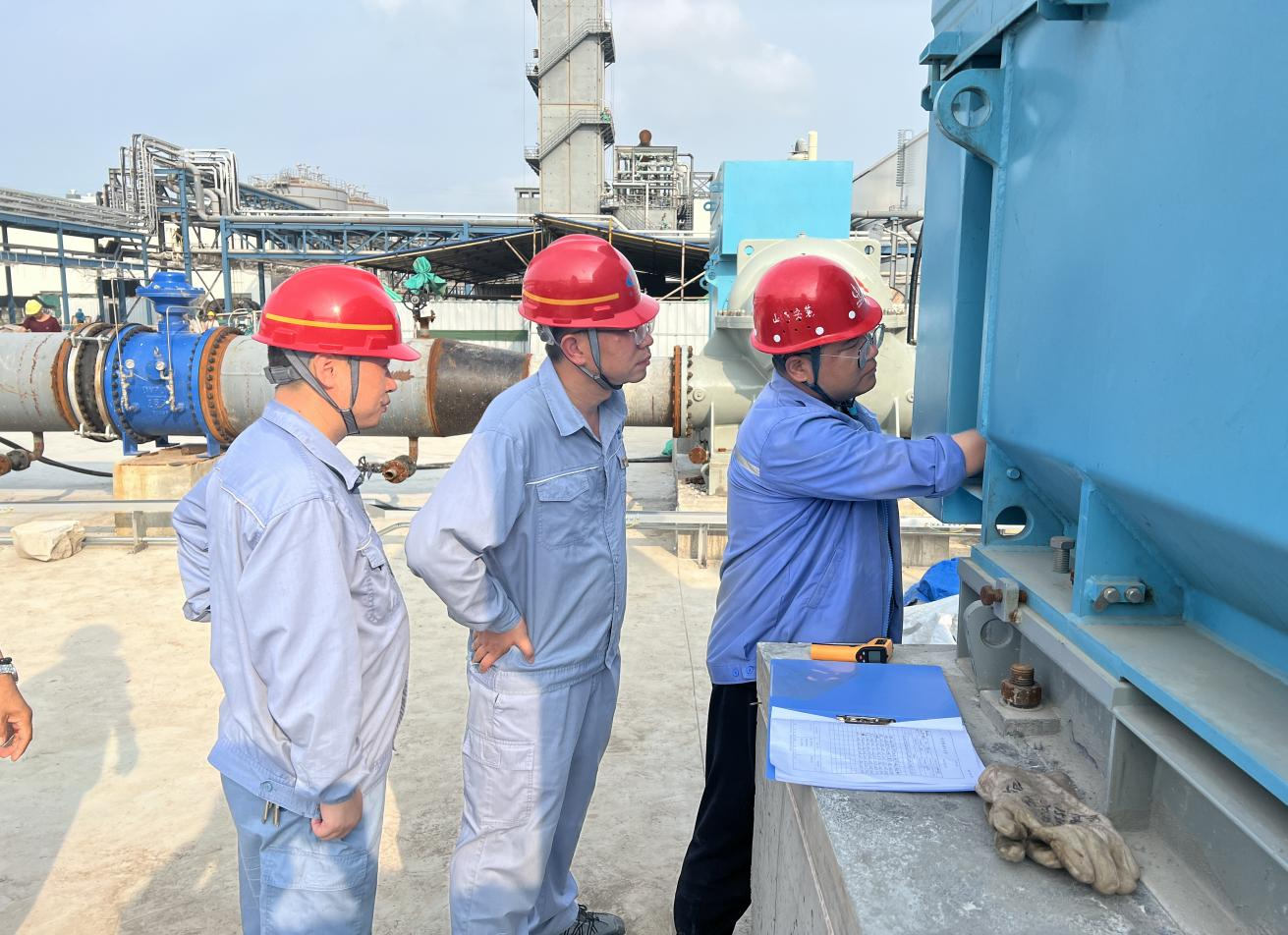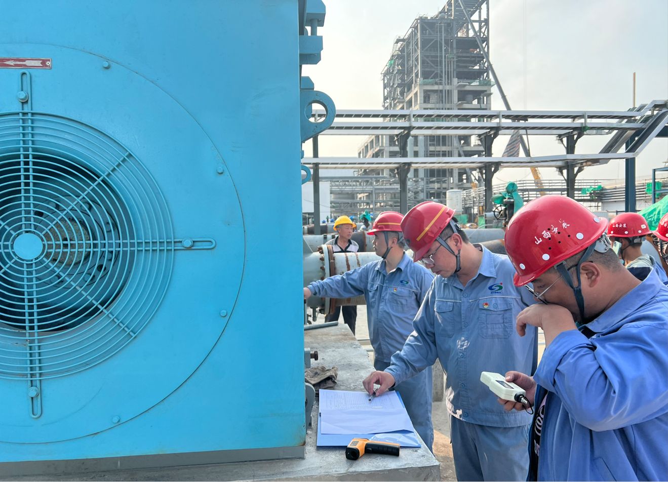 上午11:28,伴隨著“具備條件,啟動(dòng)電機(jī)”指令的發(fā)出,操作人員按下空分循環(huán)水泵P820101A“啟動(dòng)”開關(guān),電機(jī)開始高速旋轉(zhuǎn),隨后操作人員依次開啟P820101B、C。空分循環(huán)水泵單機(jī)試車的現(xiàn)場“熱辣滾燙”,大家衣衫被汗水濕透,但熱情依舊高漲。操作人員每隔15分鐘就詳細(xì)檢查記錄電機(jī)的軸溫、轉(zhuǎn)速、振值等指標(biāo)。
