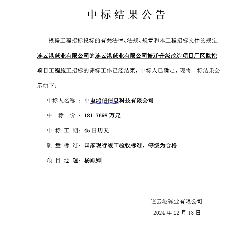 連云港堿業(yè)有限公司搬遷升級改造項目廠區(qū)監(jiān)控項目工程施工中標結果公告